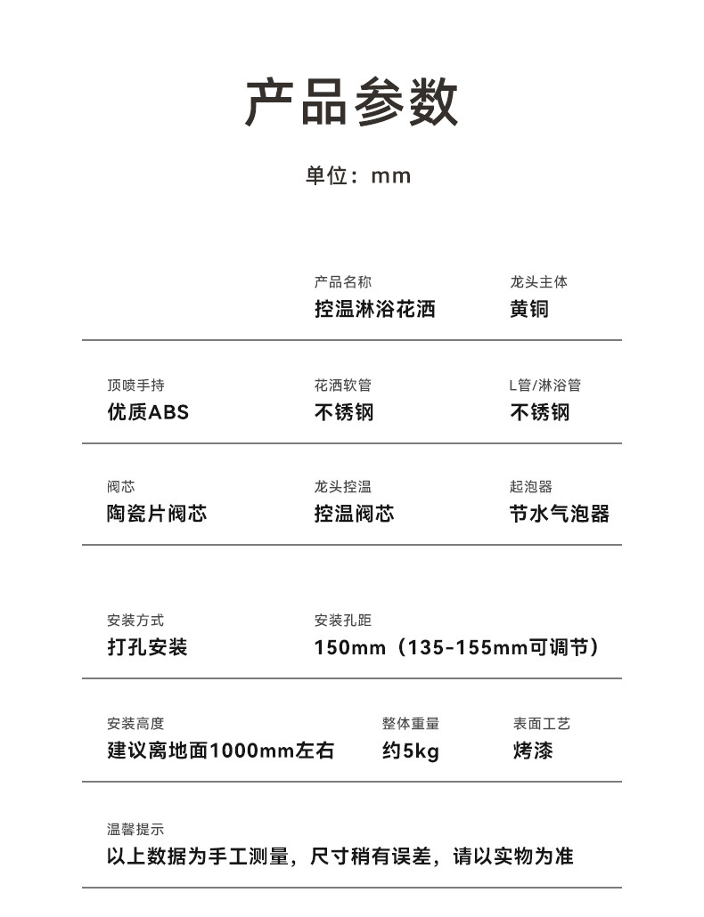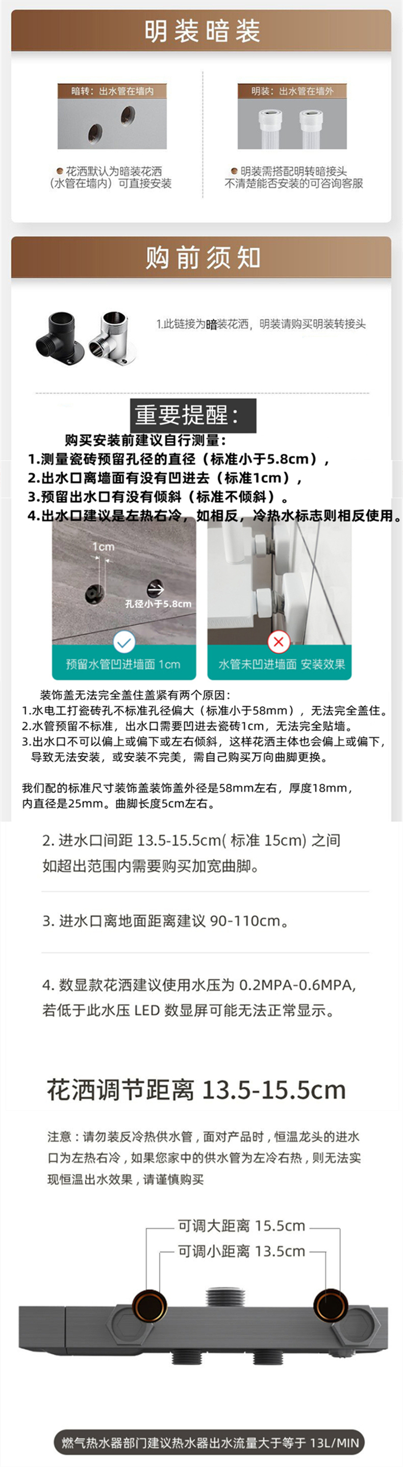 花洒是标准件,如因预留冷热出水口不标准造成的无法安装,需自行额外购买特殊配件,退换货运费自理。